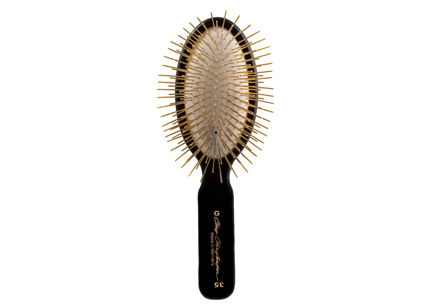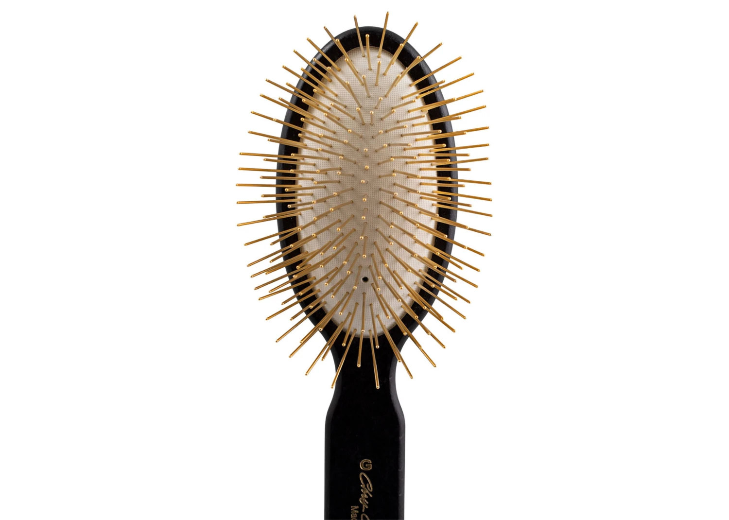 The perfect pin brushes for delicate coats. Ultra flexible cushion with ground and polished gold plated stainless steel comfort tips and 30% more pins than the original series. Lightweight and durable beech wood body.