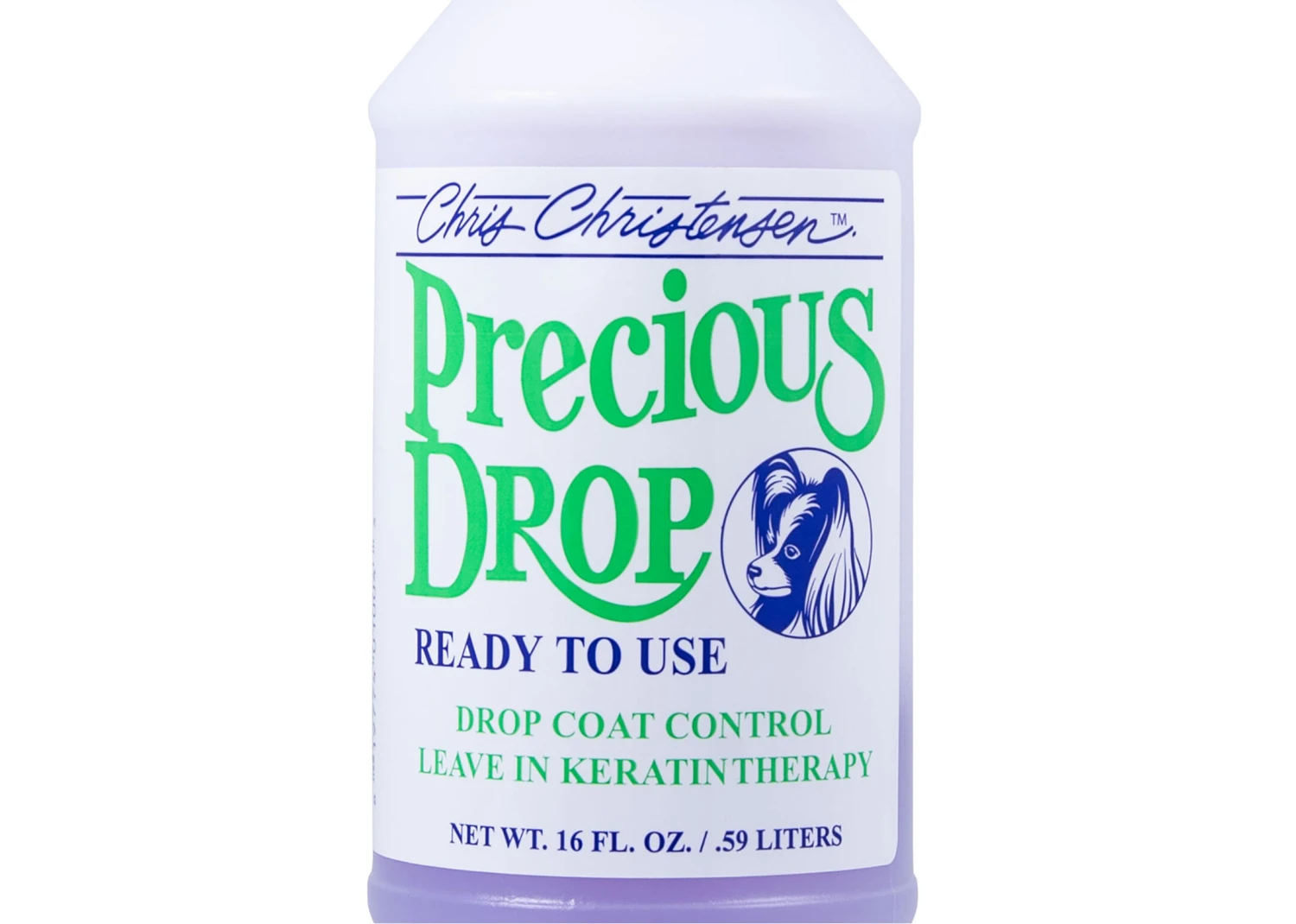 Precious Drop is a blend of Keratin Proteins and essential oils of Lavender Blossom. Infuse each strand of the hair with hydrating Precious Dropâ„¢ to reduce frizz, moisturize, reduce matting and eliminate breakage. The essence of control for all silky, unimaginably sleek, flowing coats with brilliant shine!drop coat breeds; producing soft, silky, unimaginably sleek, flowing coats with brilliant shine!