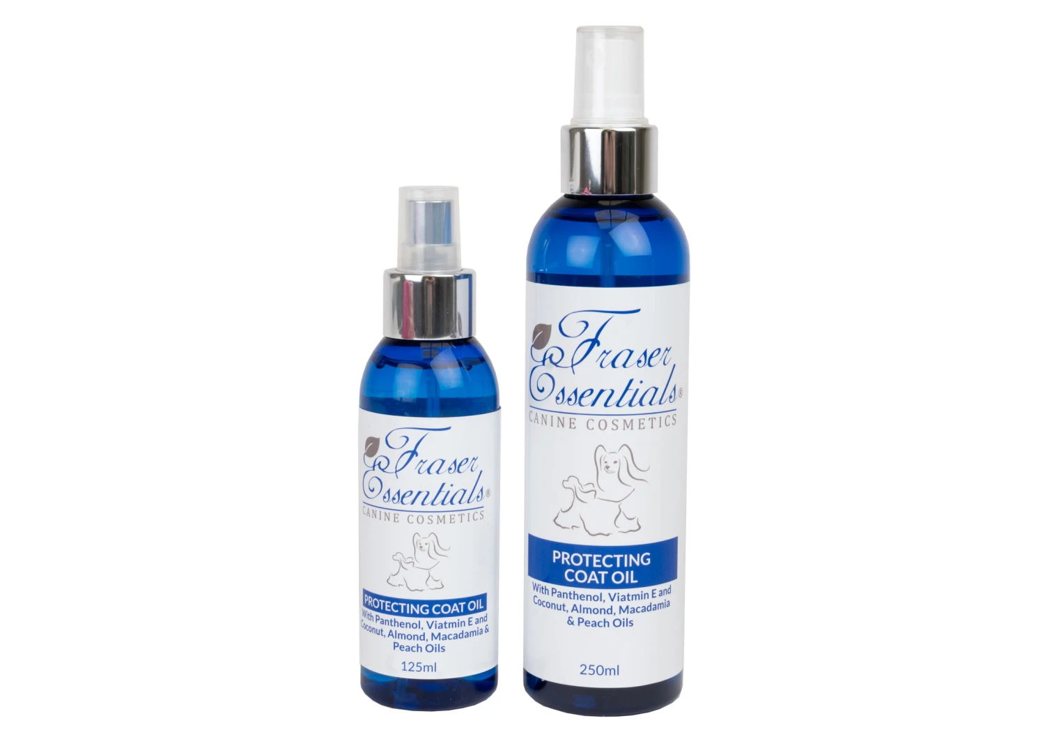 Fraser Essentials Protecting Oil is a clear and light oil that has been specifically formulated to protect and moisturize both the coat and skin of dogs. The product contains a combination of high-quality ingredients such as Panthenol, Vitamin E, and a variety of nourishing oils including Coconut, Almond, Macadamia, Peach, Soya Bean & Bisabolol Oils.