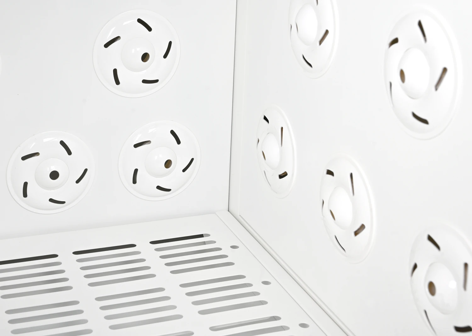 Efficient drying depends on good air volume, which this dryer produces in abundance. There are 15 air nozzles to balance air distribution in the cabin, even blowing under the floor grid so that pets are also dried quickly when they are lying down. Fresh air enters the cabin through a filter to ensure a good supply of oxygen.