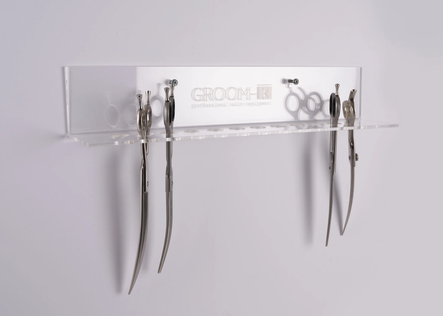Thanks to this helpful holder made out of plexi glass, you can protect and keep your scissors organised and ready to use. You save time but also space by keeping them in this very practical rack. Because of the special and compact design, it allows you to display your scissors and to have a nice overview while grooming. The durable, acrylic rack mounts easily on any vertical surface and can keep up to 12 of your favourite scissors handy and safe. All types of scissors fit in this system perfectly next to each other.