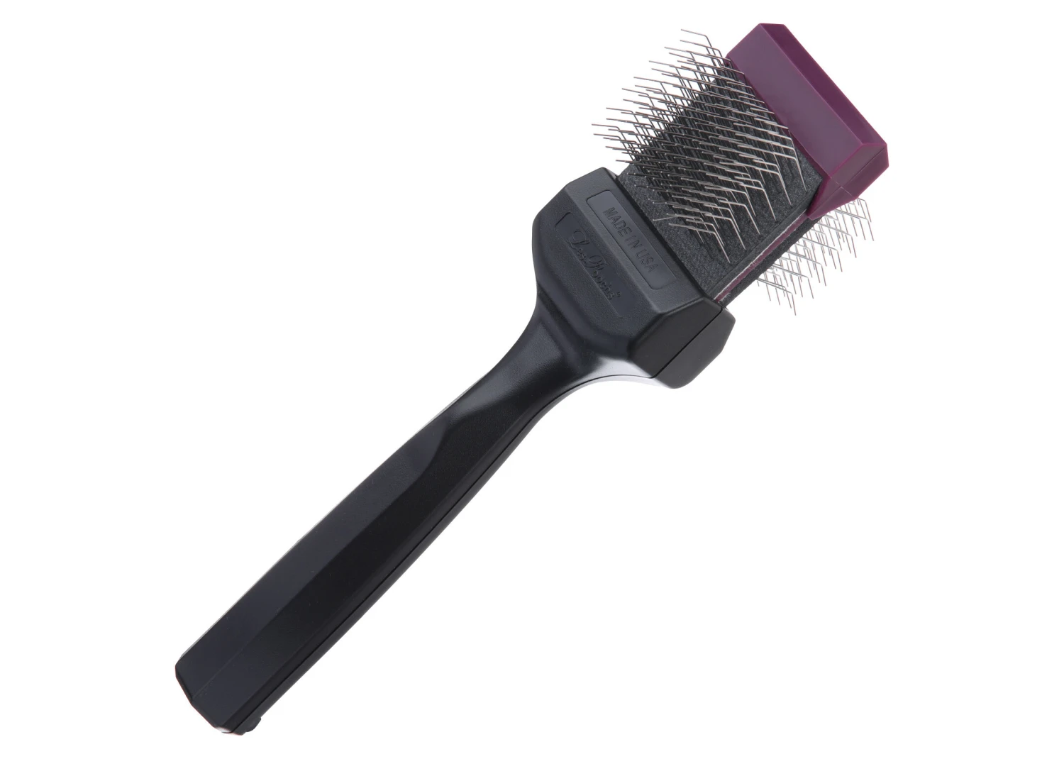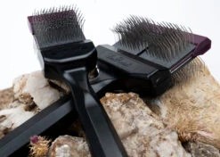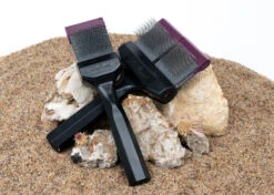 This specific Purple colored Pro brush tackles tough mats with ease and provides for superb undercoat removal. The purple ones have firm pins, what’s ideal for double coated breeds or really thick & rough coats. For example: Bichon Frisé, Golden Retriever, Border collie, Berner Sennen, and Poodles with thicker coats.