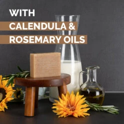 Sodium Olivate (Olive Oil), Goat’s Milk, Sodium Cocoate (Coconut Oil), Sunflower Oil, Neem Oil, Calendula Officinalis, Chamomile Essential Oil, Rosemary Essential Oil, *Citronellol, *Geraniol, *Limonene, *Linalool.