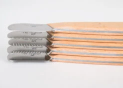The Sentinel Stripping knives are handmade and manufactured in Belgium under supervision of the famous breeder and groomer Rony Demunter. The materials used are a high-quality metal alloy which is stronger and lighter than other knives and very light – each knife weighs under 30 grams. The Beech wood used to produce the handles comes from sustainable European forests and the varnish is FCS approved as a safe A+ for the environment.Â
