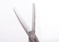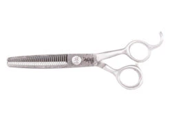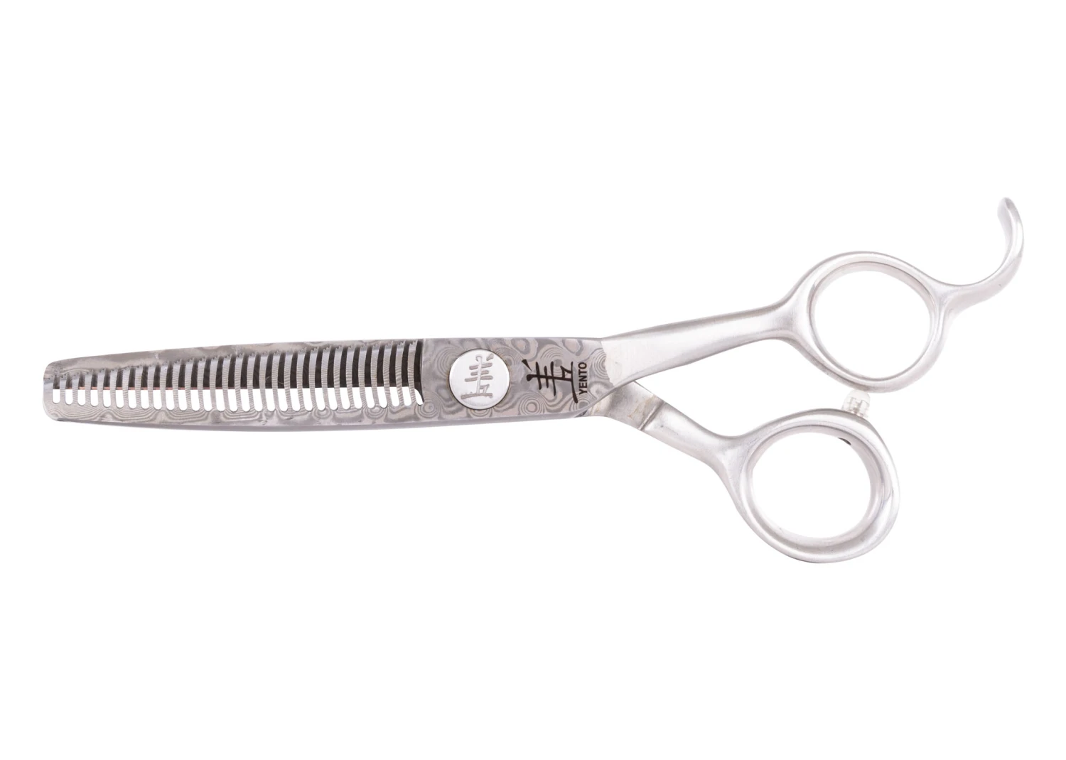 Japanese Damascus steel is renowned the world over and is famously used in Samurai swords because of its strength and hardness. This unique steel is rare, but easily distinguished by the “raindrop” pattern in the metal. Yento Damascus shears are completely hand made and go through more than 160 individual processes to produce the ultimate cutting tools. Blades are razor sharp and the comfortable, offset handles on short shanks make these shears essential equipment for professional use. The straight Damascus can be used for both heavy duty scissoring and finishing whereas the single thinner is the ultimate blending and finishing shear.